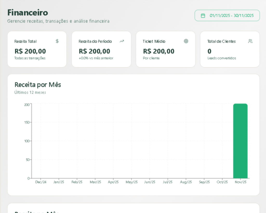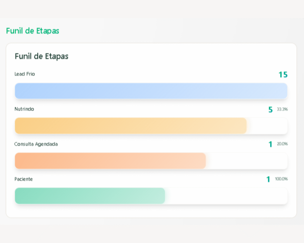 Acompanhe a jornada do paciente com funil visual e métricas de conversão detalhadas.
